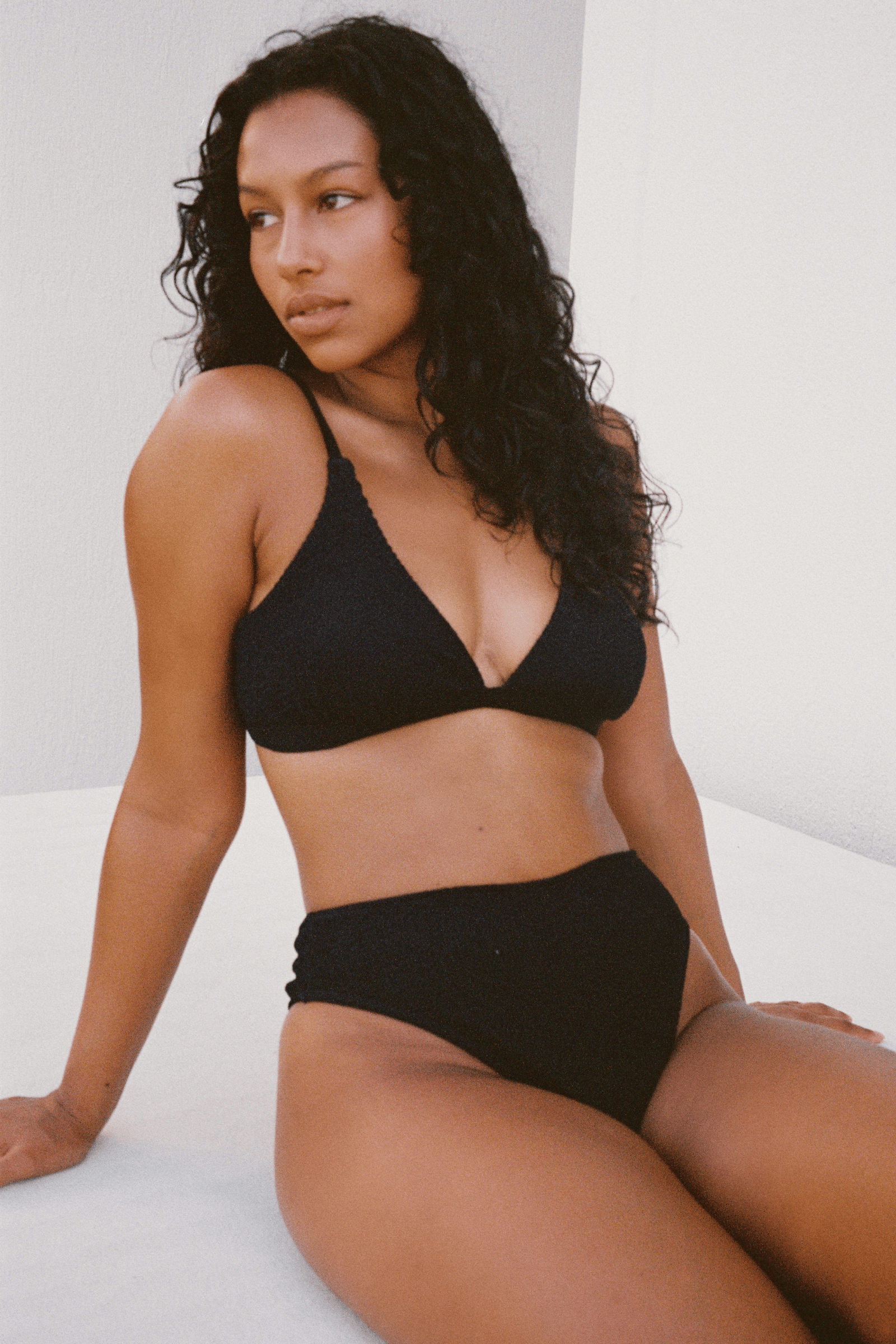 The Leila Top is a tailored triangle bralette with removable padding, adjustable shoulder straps and side boning. Created in a textured 5D fabric with power mesh lining to contour curves and give added support.