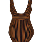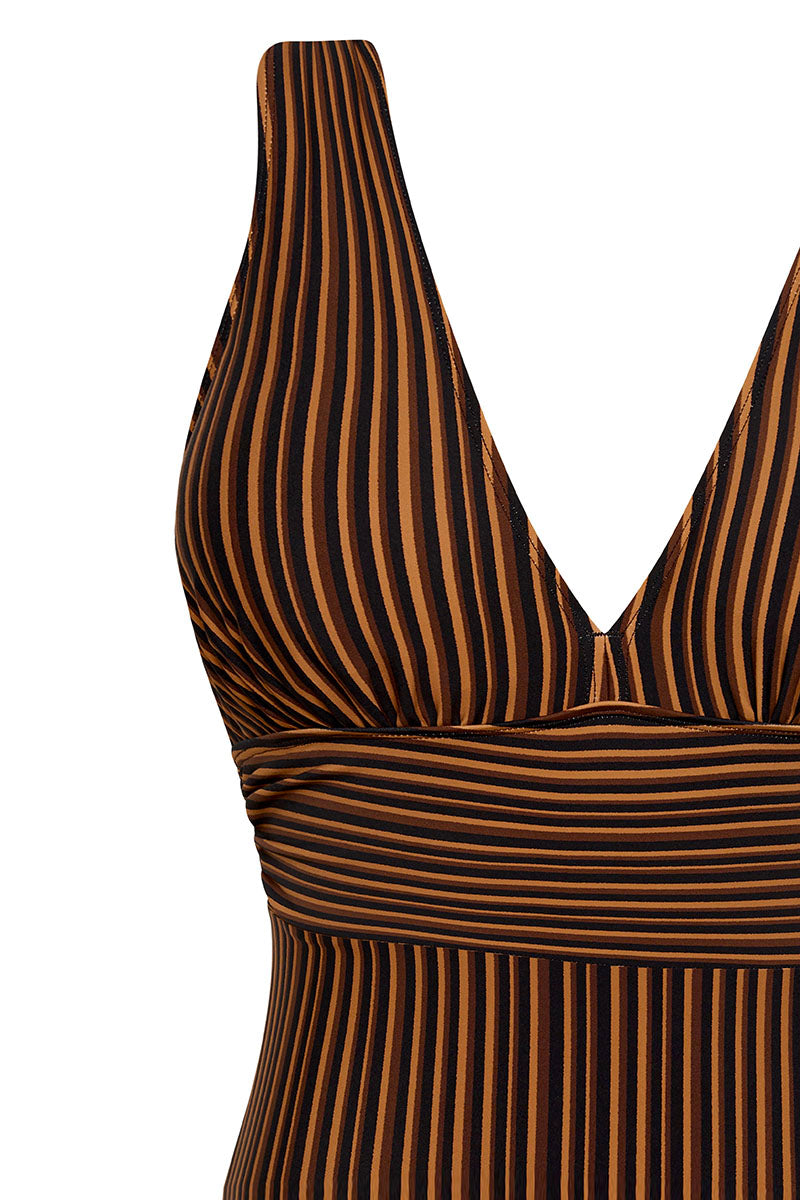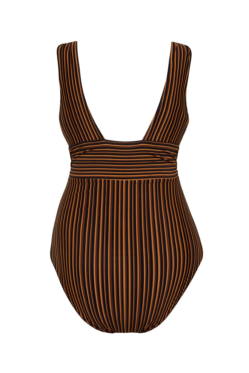 The Gaia One Piece is our newest supportive, full coverage swimsuit designed for a D-G cup. Crafted in our exclusive Bokumaia Mocha Stripe print, this classic silhouette features a low plunge neckline, ruched waist and wide shoulder straps to provide structure and support without underwire. A contemporary take on a modern classic that you’ll reach for season after season.