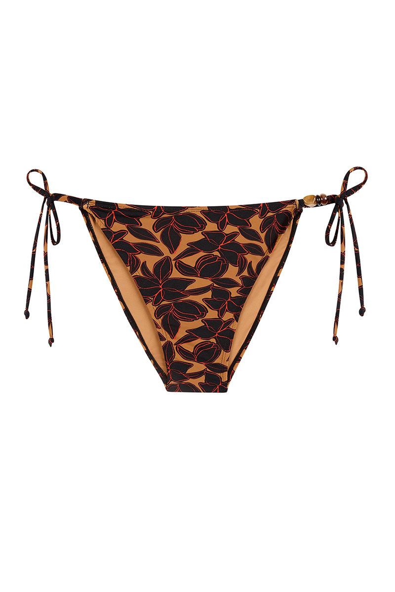 The Olah bikini bottom is a minimal, tie side brief designed to fit and flatter every body type with exactly the right amount of coverage for comfortable confidence. Crafted from form fitting lycra in our exclusive Bokumaia Noir Hibiscus print, it features an asymmetric cluster of beads on the left side.