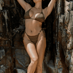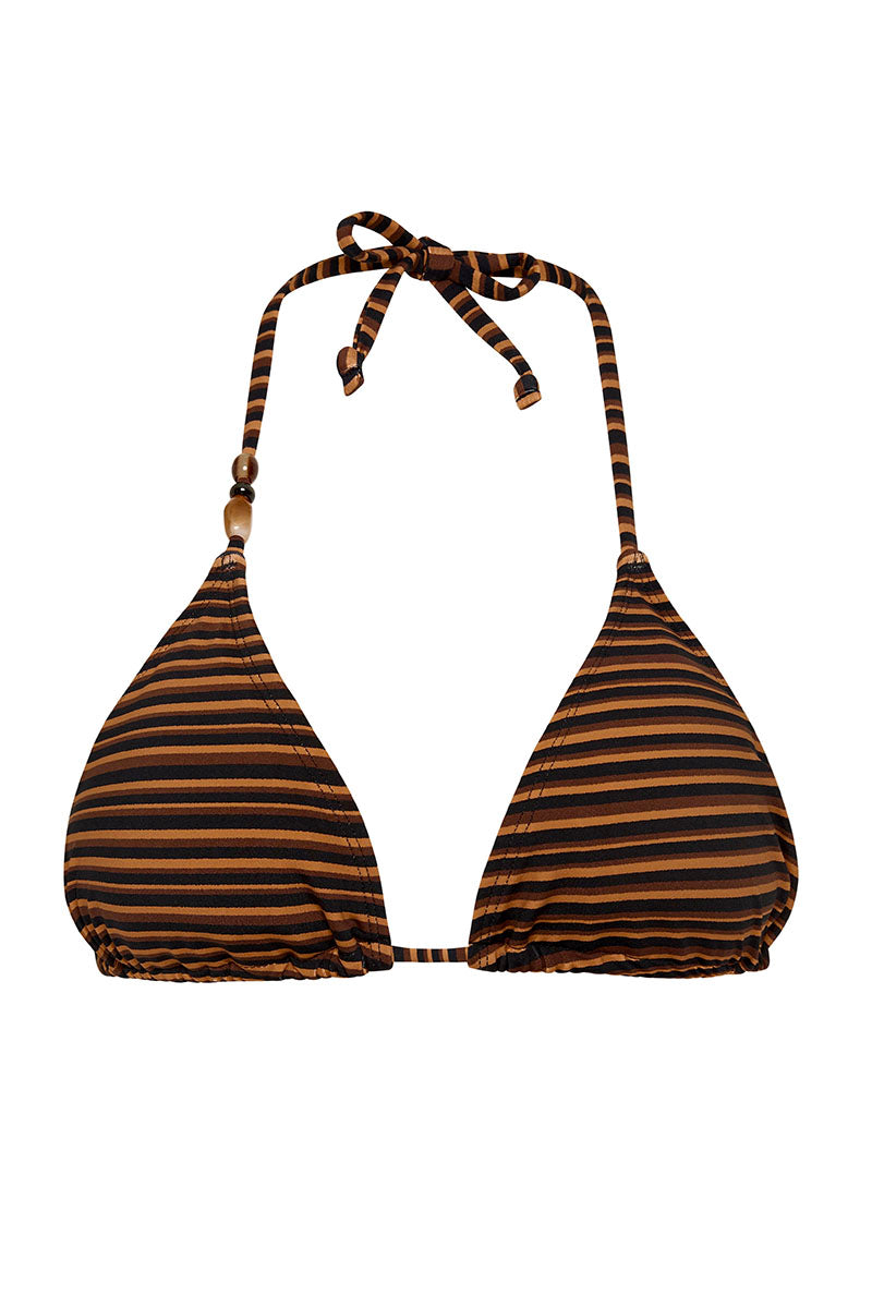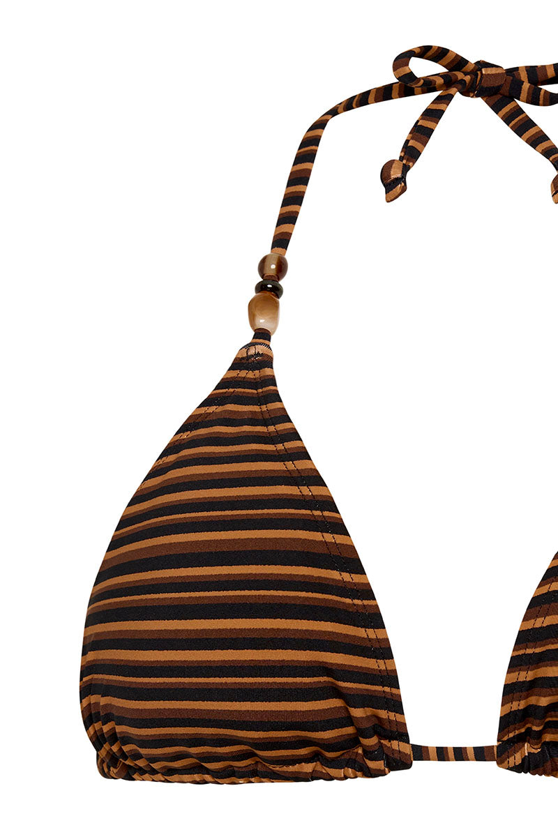 Crafted from form fitting lycra, the Olah Top is a timeless, tri string halter bikini top with removable padding and sliding cups for adjustable coverage. Designed in our exclusive Bokumaia Mocha Stripe print with an asymmetric bead detail on the right strap, the Olah is flattering on all bust sizes.