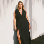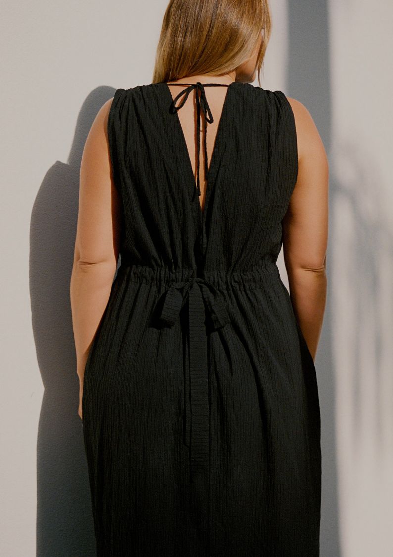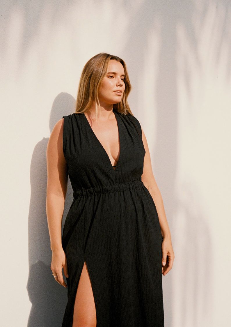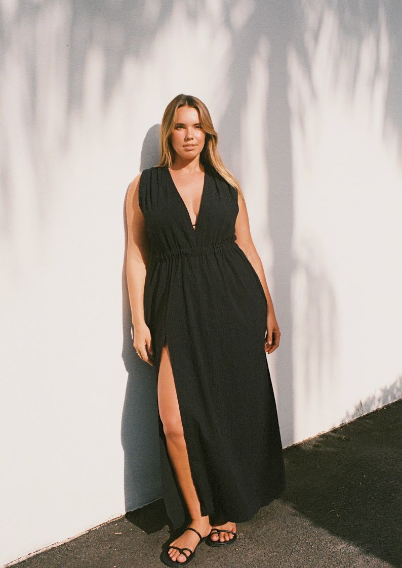 Designed with summer occasions in mind, the Agnes Maxi Dress in black offers a refined, effortless hour glass silhouette with true day to night versatility. It features a flattering plunge neckline, ruched waist, adjustable tie back and front split for ease. Crafted from our signature lightweight textured cotton fabrication with subtle stretch, this dress maintains undone elegance season after season. Best paired with our Leila Bikini Top for additional support and structure.