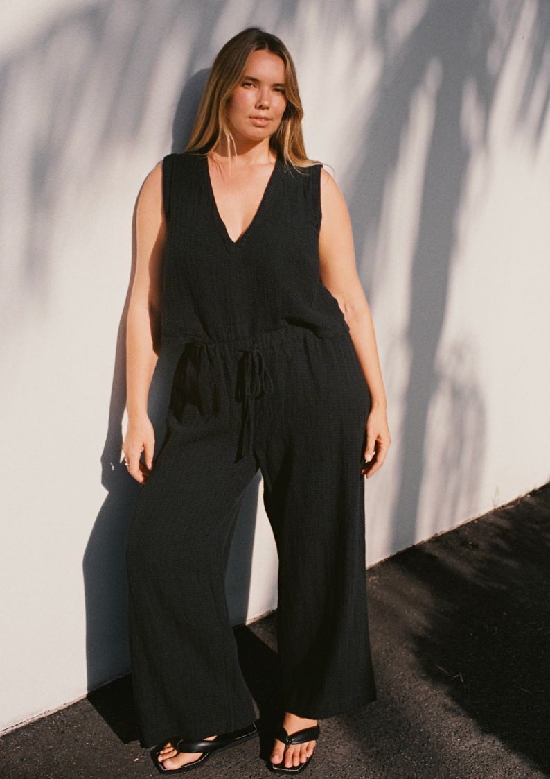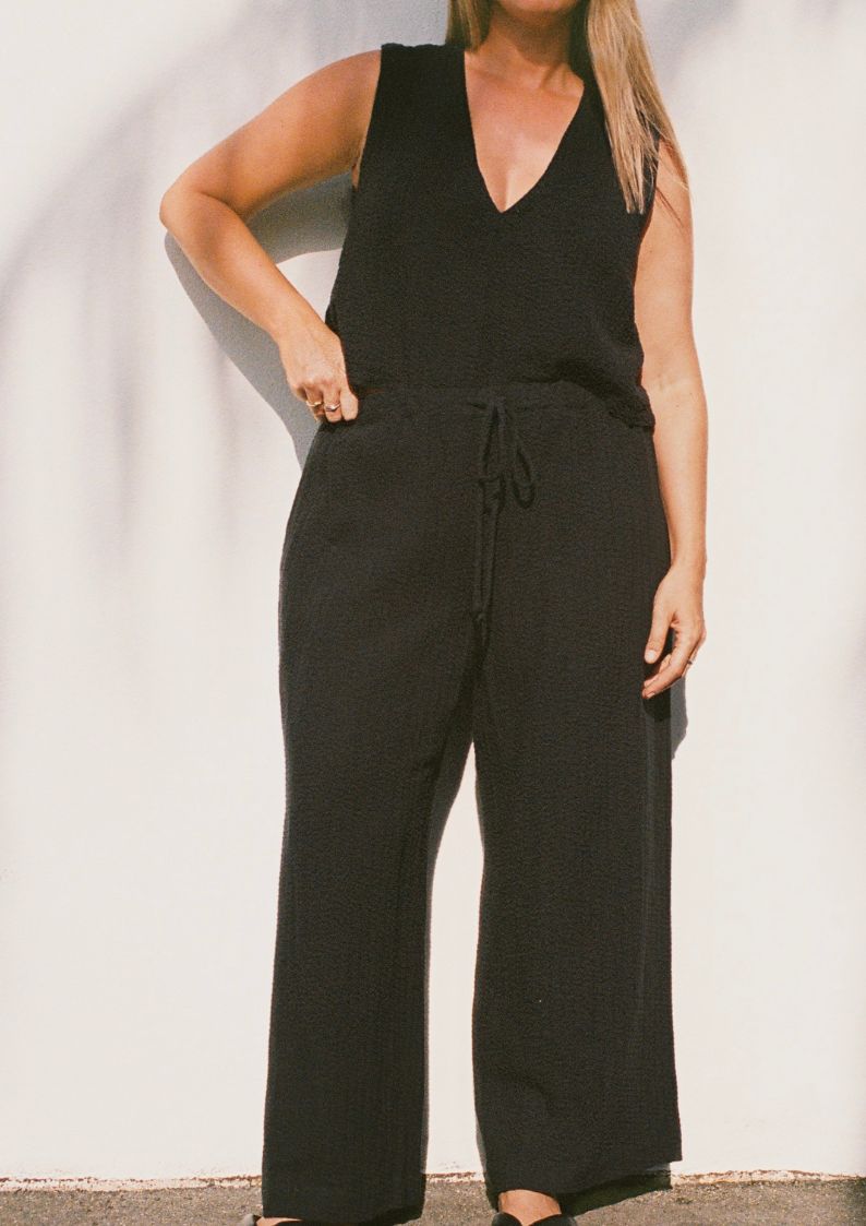 The Echo pant in black is a classic, summer wardrobe essential. Cut from a mid-weight textured linen fabrication, this pant offers maximum comfort and everyday ease. Featuring relaxed fit, wide leg, drawstring waist and anchored elastic waistband that doesn’t twist. Perfectly paired with our Echo Sleeveless V-Neck Tank in Black.