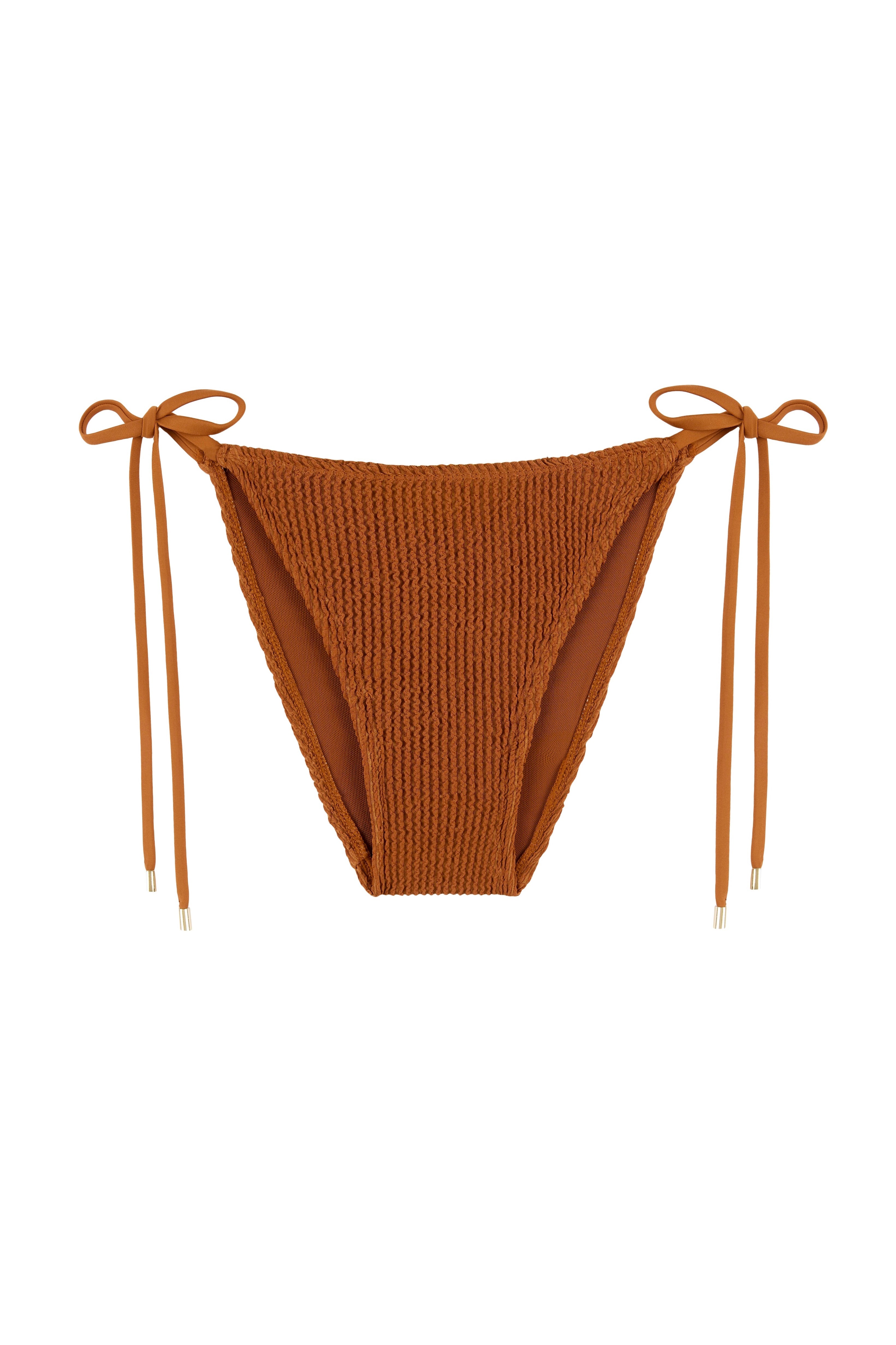 Caramel brown textured tie side bikini bottom designed to fit and flatter curves.
