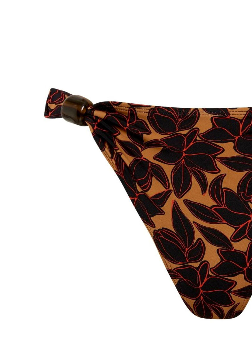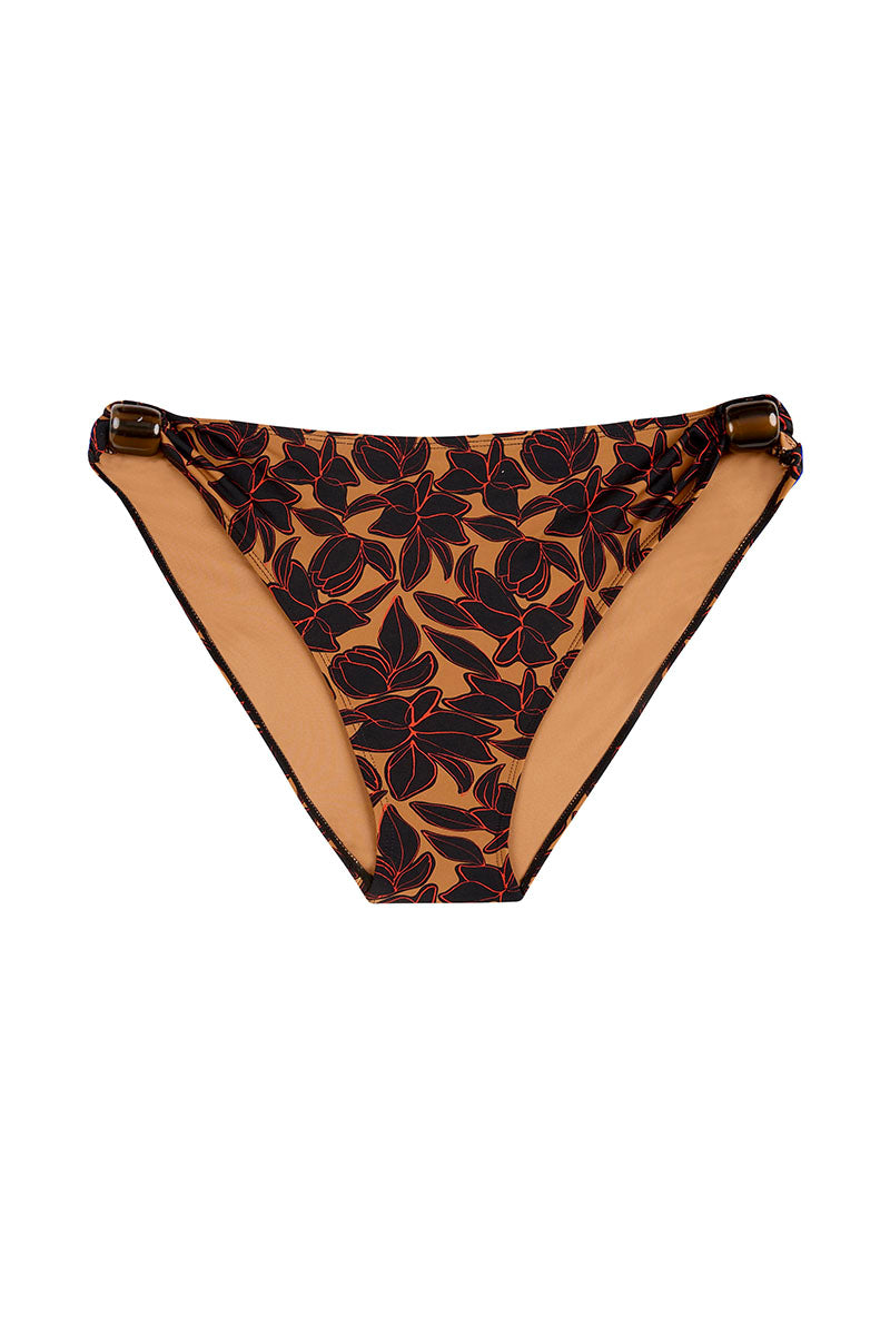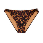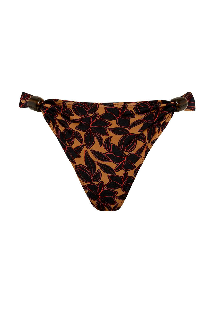 The Delphine is our newest ultra flattering mid rise, full coverage bikini brief. Designed with a unique versatility to sit both low or high on the hips, the Delphine offers comfort and flexibility with adjustable resin bead details on each hip. Made in our exclusive Bokumaia Noir Hibiscus floral print, this brief pairs perfectly with our Delphine Top.