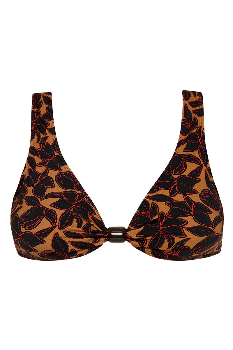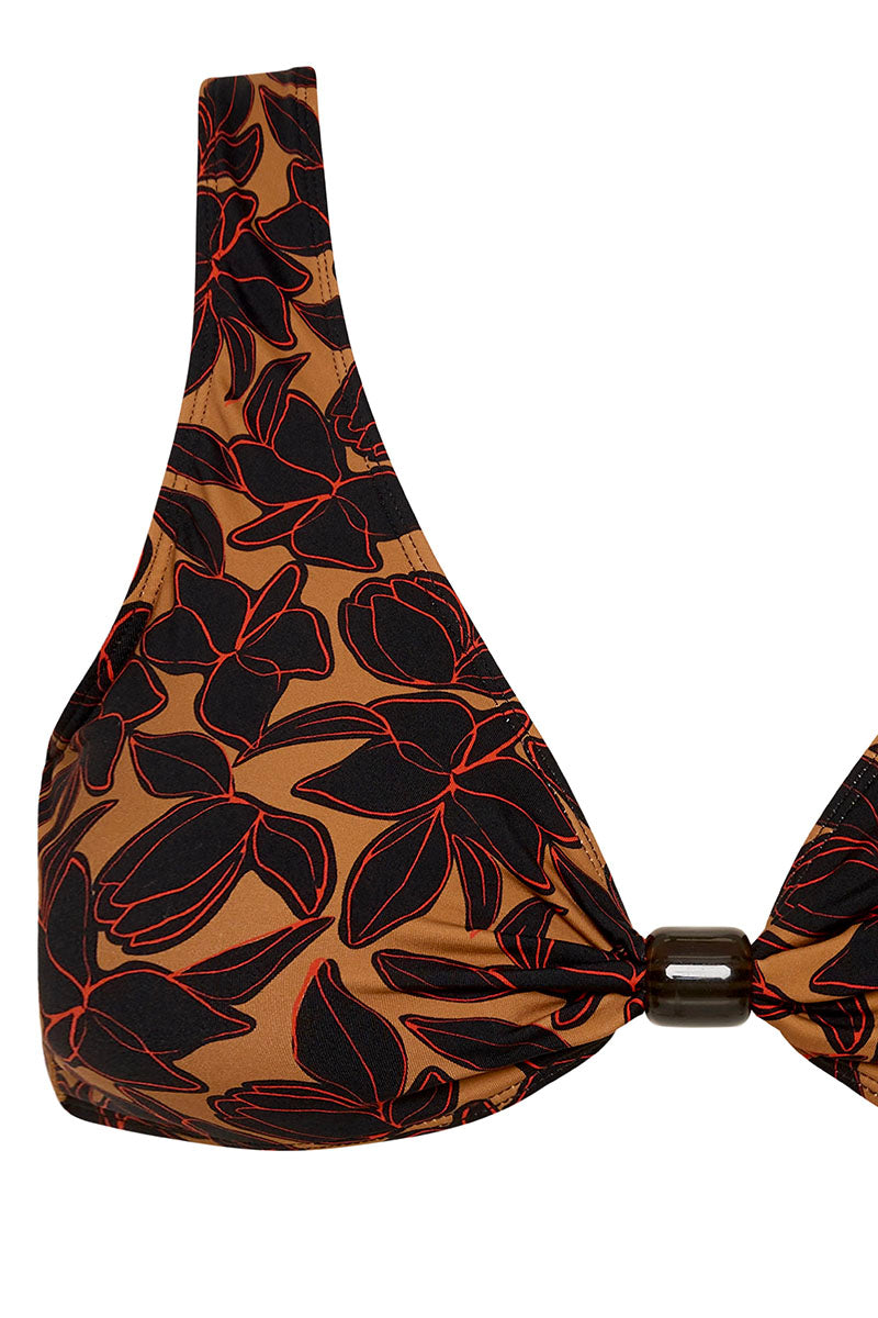 The Delphine bikini top offers the perfect balance of structure, support and comfort. This underwire-free top features a plunge neckline with wide supportive shoulder straps, a centre front resin bead detail and back tie for custom fit. Designed in our exclusive Bokumaia Noir Hibiscus print, this is a fresh take on a classic swim silhouette best suited for D+ cups.
